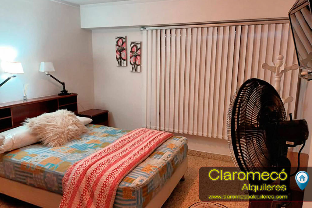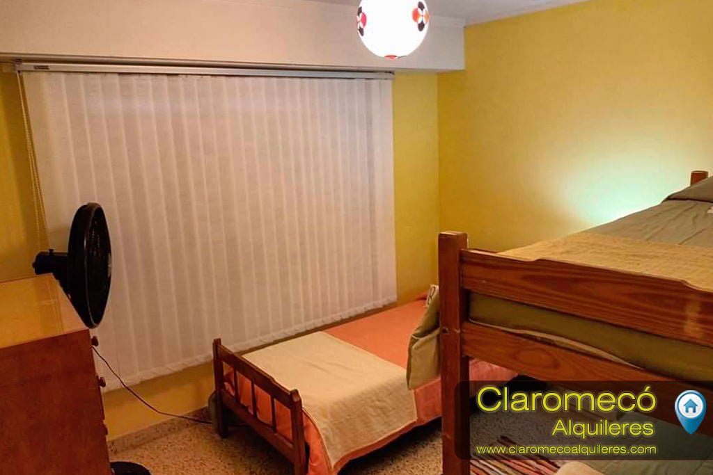 Dos habitaciones: 1 cama matrimonial con tv, 1 cama individual + cucheta, ventiladores de pie.