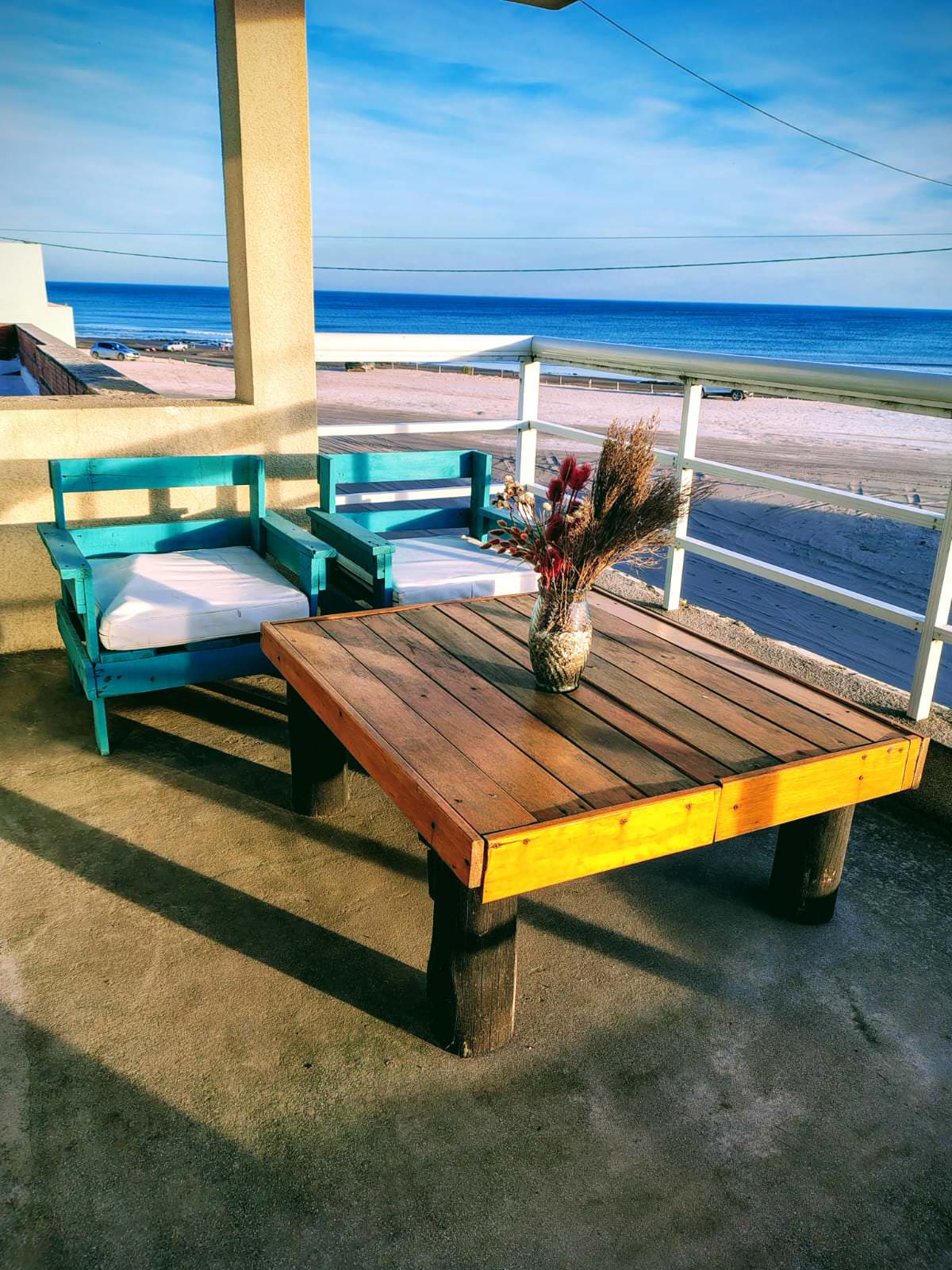El departamento de planta alta cuenta con: Capacidad para 5 personas, un dormitorio principal con sommier queen de dos plazas y otro dormitorio con tres camas individuales. Baño completo con bañera, cocina completa con hornallas/horno, purificador de aire, barra desayunadora integrada al comedor y balcón con vista al mar.